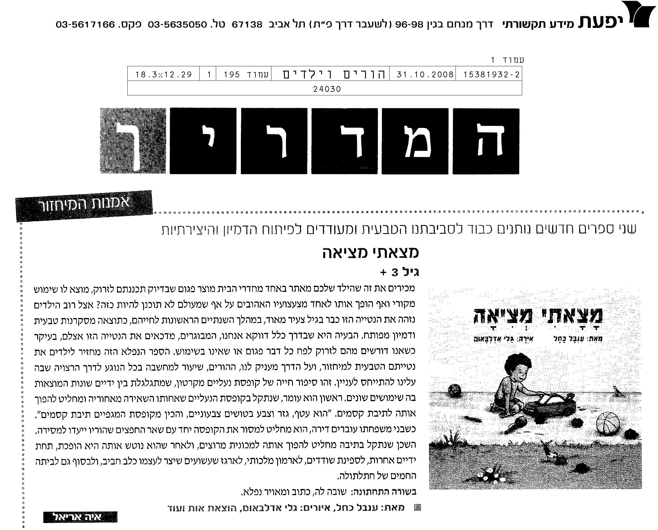 בהמשך לנושא השנתי לשנת תשס"ט שפרסם משרד החינוך, מיחזור ואיכות הסביבה ברצוני להמליץ מאוד על ספר ילדים חדש בשם ''מצאתי מציאה'' שכתבה ענבל כחל בהוצאת אות ועוד שנמכר בימים אלה בחניות.